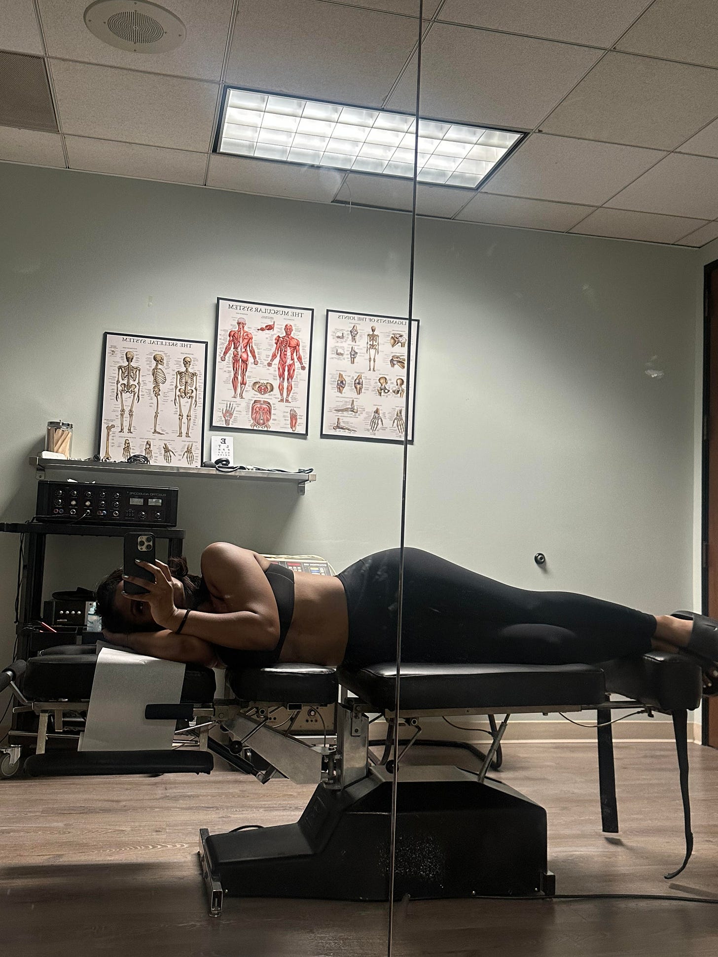 So here I am, back at the chiropractor. I refuse to get the loud neck adjustment where they twist and crack and it sounds like popcorn in your spine—..so thankfully, for this injury, all they do is have you lay on your stomach, press down, pop the rib back into place, then lay on your back, flip your leg, fold your arms, wait for their body pressure.... and you wake up feeling brand new.
